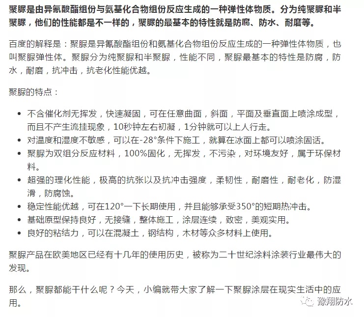 聚脲材料的防水性能非常优越,喷涂后的聚脲形成一个整体类似橡胶层一样的整体防水层,所以,水分根本进不去。